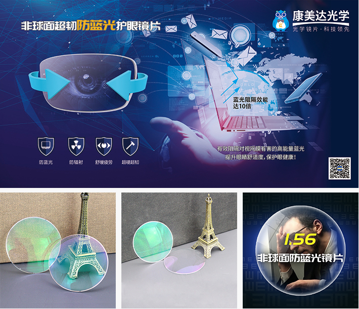 康美达光学防蓝光镜片具有阻隔高能量蓝光的作用,保护长时间使用电脑的人群眼睛不受蓝光伤害。